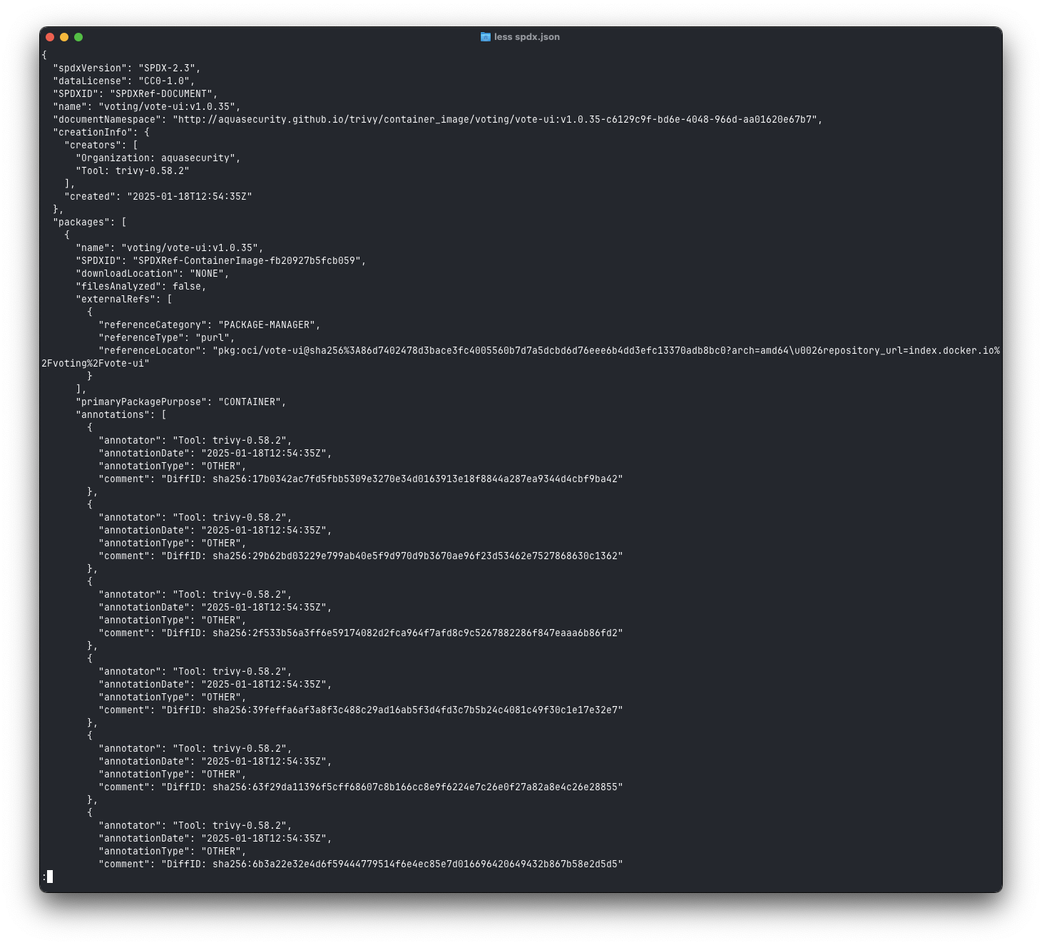 trivy image --format spdx-json --output spdx.json voting/vote-ui:v1.0.35This command generates the SBOM in a spdx format. The screenshot below shows an extract of this (very large) file.